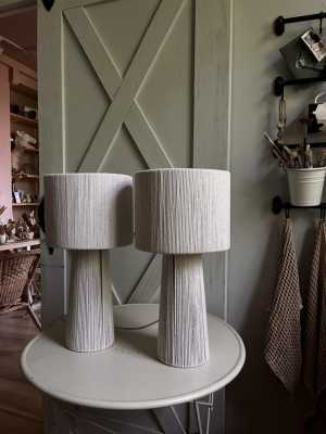 Два светильника ручной работы, выполненные на металлическом каркасе и оплетены белым веревочным шнуром.