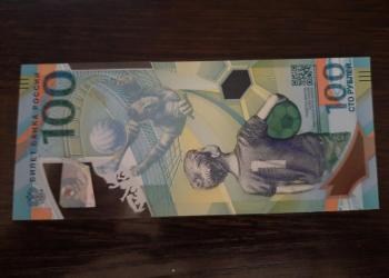 Банкноты 100 рублей и две монеты 25 рублей посвященные чемпионату мира по футболу в России, 2018 год.
