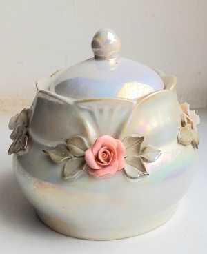 Фарфоровая перламутровая сахарница с розами, ручная работа, фирма Alan Кисловодск, высота 11 см, диаметр 11 см.
